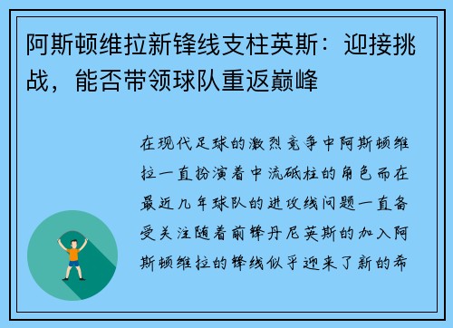 阿斯顿维拉(Aston Villa)是英格兰足球历史上备受瞩目的俱乐部之一,拥有着辉煌的过去和丰富的足球文化。近年来,阿斯顿维拉逐渐恢复了其在英超中的竞争力,吸引了球迷们的关注和热情。本文将通过对阿斯顿维拉的精彩赛事分析和球员表现的深度剖析,带领大家回顾这支球队的精彩表现和成长轨迹。我们将从多个角度...